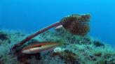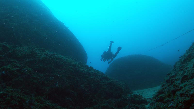 Zu der Stelle gelangt man mit dem Boot, das man an der inneren, östlichen Seite des Kaps, wegen des Mistrals, der täglich bläst, verankert. Nach dem Abtauchen taucht man parallel zur Küste in Richtung Süden. Nach dem Fall in 33 Meter Tiefe erblickt man die „Pyramiden“. Man taucht durch einen kleinen Durchgang in Richtung Westen und dann geht man links um sie herum. Nach der ersten taucht man bis zur nächsten, die sich in 40 Metern Tiefe und ihre Spitze in 36 Metern befindet. Die Spitze der dritten Pyramide ist in 35 Metern Tiefe. Nach der Besichtigung kehrt man an die Abtauchstelle zurück.Meeresleben