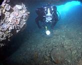 One of the cave’s entrances lies 5 m beneath the steps to the lighthouse, while the other is at 17 m. A meandering tunnel leads to the cave which is large enough for 2-3 divers. The site is a combination of the cave and wall, which extends from the second entrance and drops to 50 m and a sandy seabed. Exploration requires flashlights, and care should be taken not to disturb the sediment with fins, reducing visibility. The site is reached by boat which is moored at the lighthouse stairs.Marine life